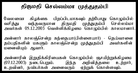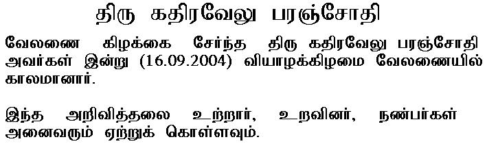KMrs Paramsothi Mrs Paramsothi expired at Velanai. Cremation on 18th September Sunday at Velanai.