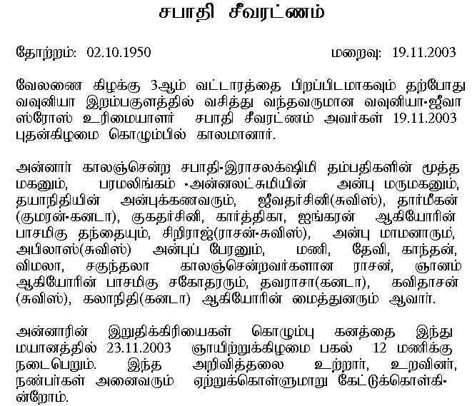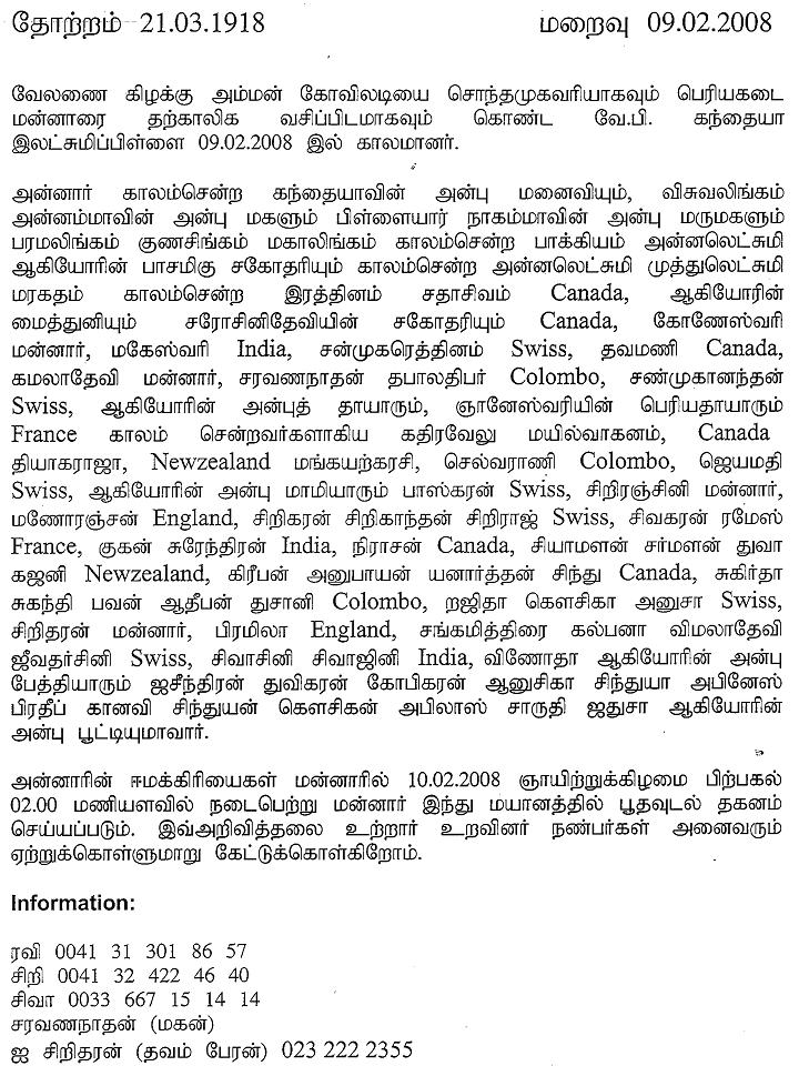 செவ்வாய்கிழமை வேலணையில் காலமானார். இறுதிக் கிரியைகள் பற்றிய விபரம் பின்னர்